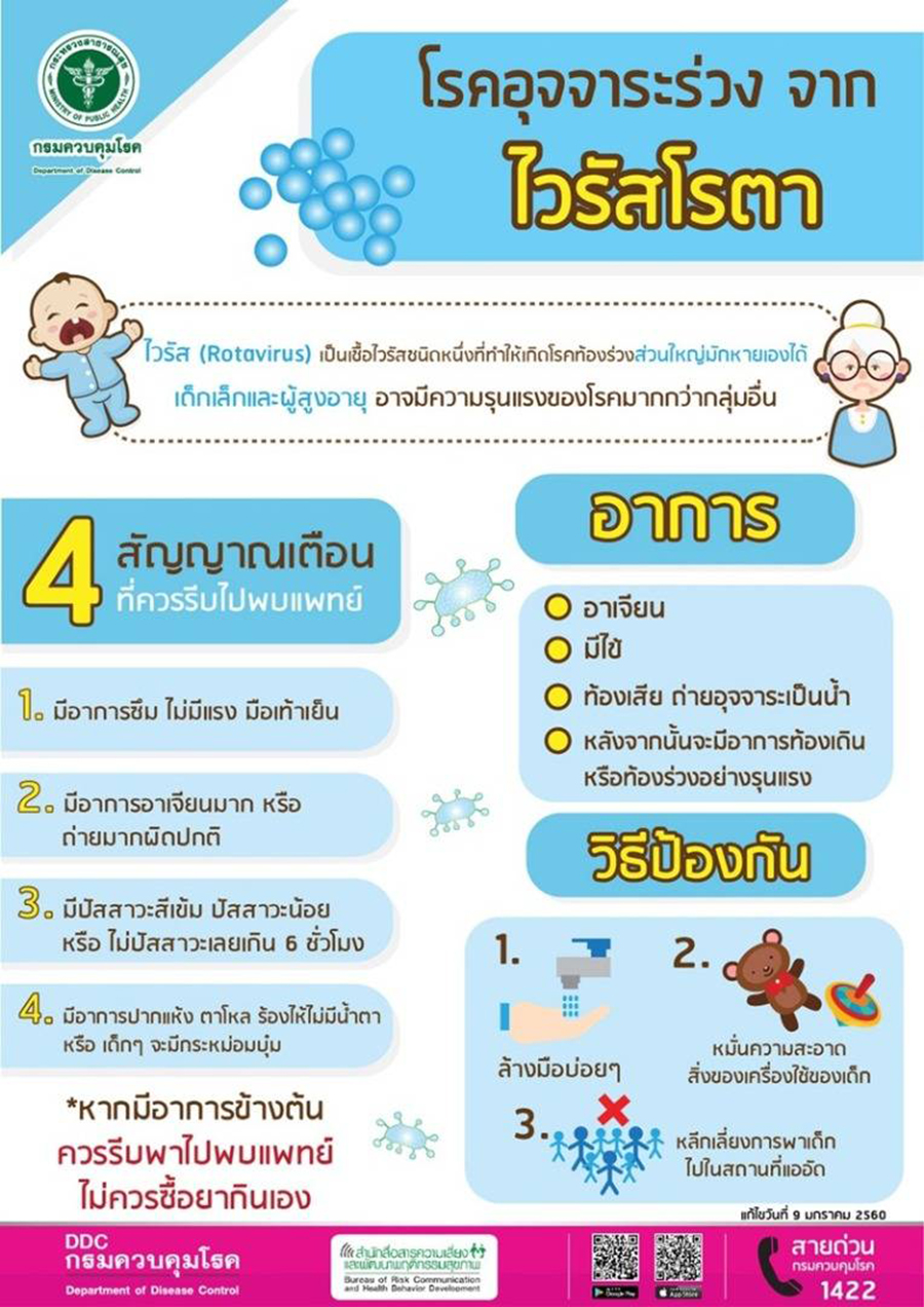 กรมควบคุมโรค เผยแพร่ข้อมูลเกี่ยวกับ "ไวรัสโรตา" ซึ่งเป็นเชื้อไวรัสที่ทำให้เกิดโรคท้องร่วง โดยจะมีอาการอาเจียน มีไข้ ท้องเสีย ถ่ายอุจจาระเป็นน้ำ และหลังนั้นจะมีอาการท้องเดิน หรือท้องร่วงอย่างรุนแรง ซึ่งเด็กเล็กและผู้สูงอายุอาจพบความรุนแรงของโรคมากกว่ากลุ่มอื่น แต่โดยปกติแล้วผู้ป่วยสามารถหายเองได้