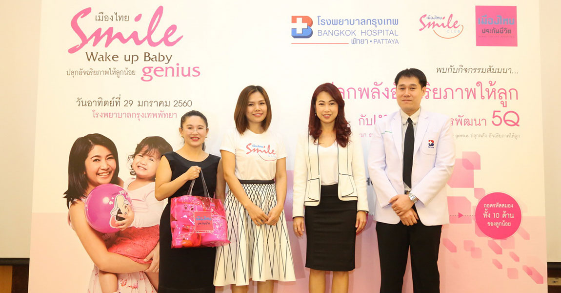 วันอาทิตย์ที่ 29 มกราคม 2560 เวลา 8.30 – 12.00 น. ณ ห้องประชุม ดี 1 โรงพยาบาลกรุงเทพพัทยา ได้มีการจัดกิจกรรม “เมืองไทย Smile Wake Up Baby Genius ปลุกพลังอัจฉริยภาพให้ลูก” โดยมี พญ.ปิยาภรณ์ ทิพยะรัตน์ ผู้ช่วยผู้อำนวยการ โรงพยาบาลกรุงเทพพัทยา และคุณไพจิตร สิงหาโชติ ผู้ช่วยผู้อำนวยการอาวุโส ฝ่ายบริหารพันธมิตรสัมพันธ์ บริษัท เมืองไทยประกันชีวิต จำกัด (มหาชน) ให้การต้อนรับครอบครัวที่ร่วมกิจกรรม และกล่าวเปิดงาน ภายในงานมีกิจกรรมซึ่งมุ่งเน้นการพัฒนาการทางสมองของเด็ก อาทิเช่น สัมมนา Wake up baby genius ปลุกพลังอัจฉริยภาพให้ลูก Workshop 5Q development รวมถึง Yoga for kids และทดสอบ Brain Scan Fingerprint ซึ่งได้รับควาสนใจจากผู้เข้าร่วมกิจกรรมเป็นอย่างมาก